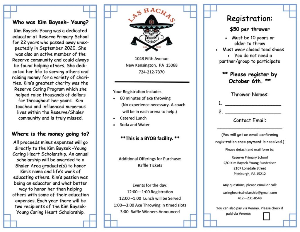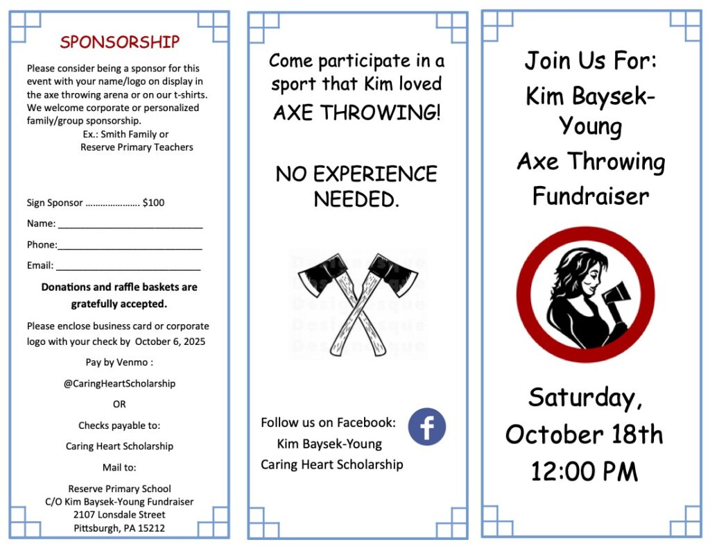 The Kim Basek Young Ax Throwing Fundraiser will be held Saturday, October 18th. All proceeds benefit the Kim Basek Young Caring Heart Scholarship. Reach out to caringheartscholarship@gmail.com for more info.