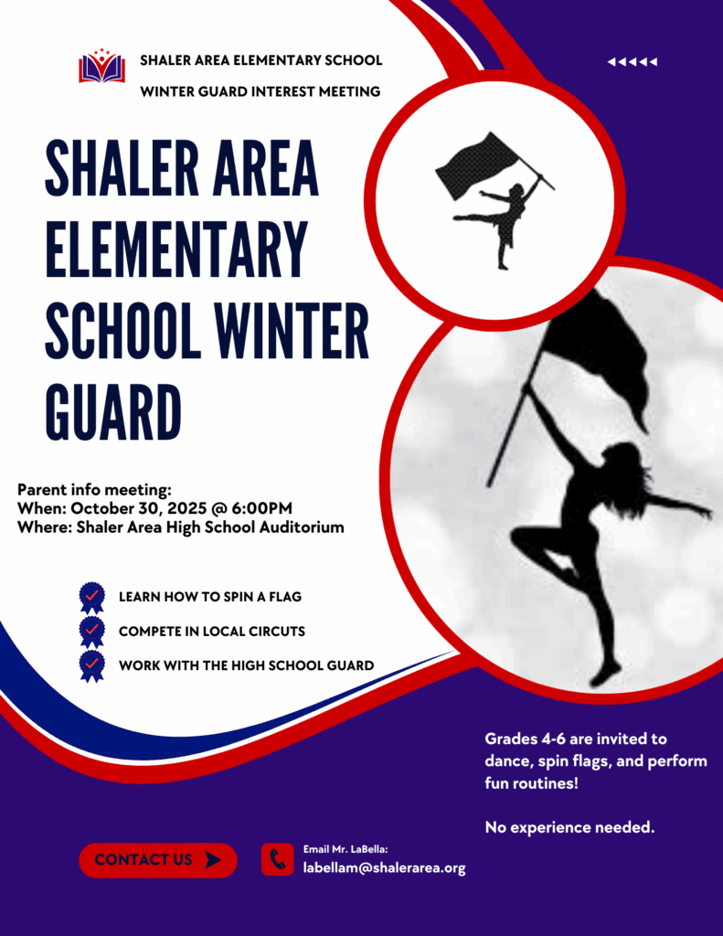 Students in grades 4-6 are invited to dance, spin flags, and perform fun routines with Elementary School Winter Guard! There will be a parent informational meeting on Thursday, October 30th at 6pm in the High School Auditorium for interested participants. Any questions, please email labellam@shalerarea.org.