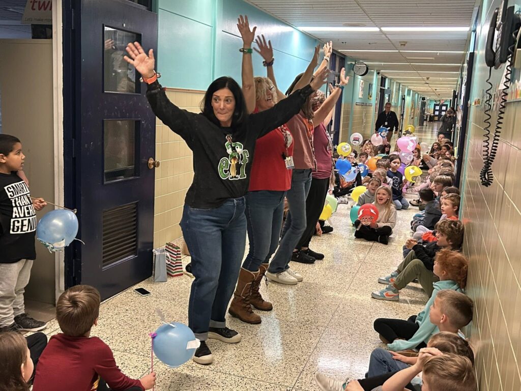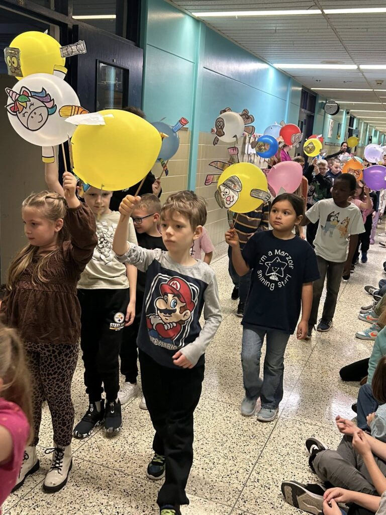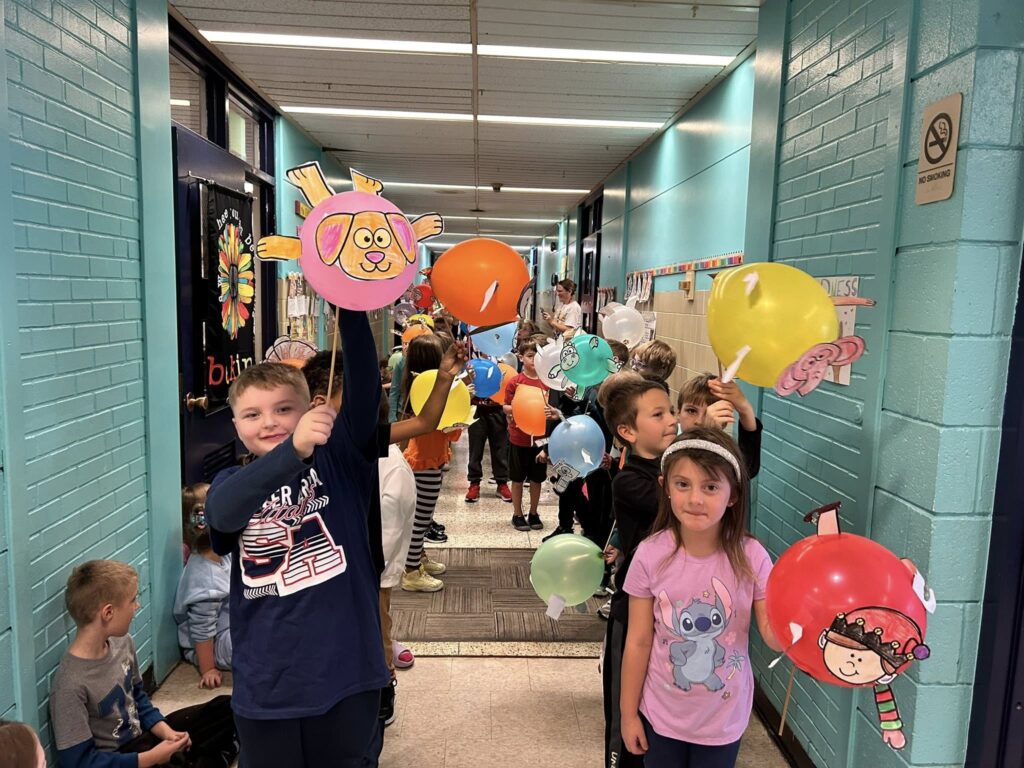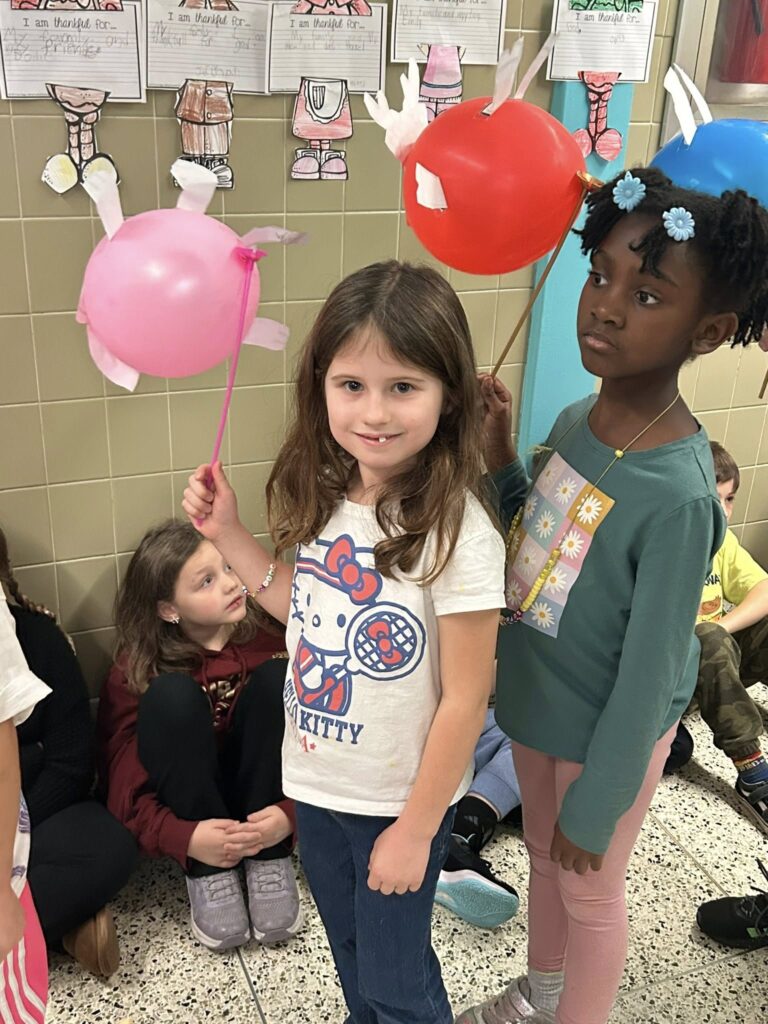 Before Thanksgiving, the students read about the balloons in the Macy’s Day Parade in Balloons Over Broadway and created their own balloons, which they proudly showcased during a parade through the halls for all to see. The event even included some special performances from the first-grade teachers.