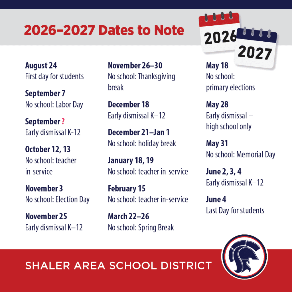 At the February 18 Board of School Directors meeting, the Shaler Area Board officially approved the 2026–2027 School Calendar. We know how important advance planning is for our families, and we […]
